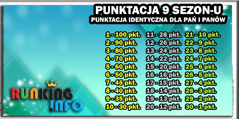 - Z każdego biegu zaliczanego do RUNkingu punkty zbiera 30 najszybszych biegaczy oraz 30 najszybszych biegaczek. W każdych zawodach drużyna będzie miała okazję zdobyć maksymalnie 480 punków (1,2,3 miejsce u mężczyzn oraz 1,2,3 miejsce u kobiet). Tak jak widzicie punktacja w porównaniu do biegów indywidualnych nie zmienia się.