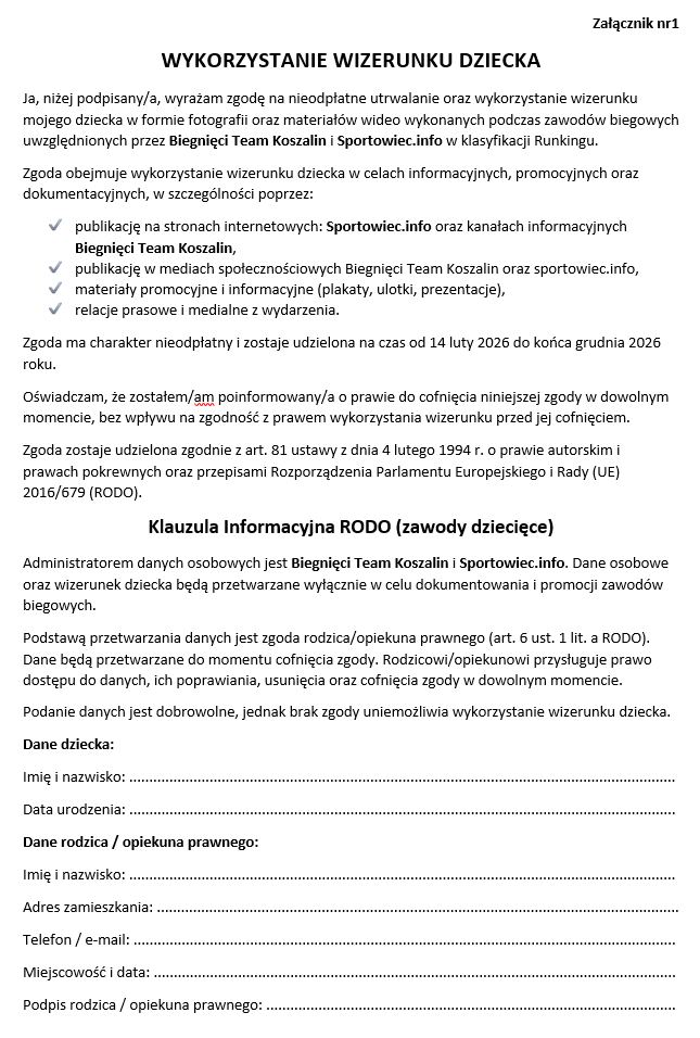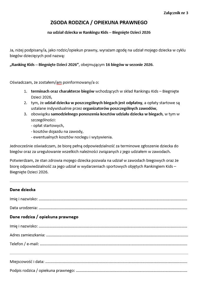 Rodzice, którzy chcą, aby ich dziecko wzięło udział w Runking Kids – Biegające Dzieci 2026, muszą wyrazić zgodę na: